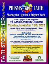 FaithsTogether of The Woodlands will host its 27th Annual Community Observance on Tuesday, November 18, with the prelude beginning at 6:50 p.m.and program beginning at 7:00pm. This year’s host is the Hindu Temple of The Woodlands at 7601 S Forestgate Dr. The Woodlands 77382. The theme for 2025 is Prisms of Faith - Sharing Our Light for a Brighter World. This beloved community tradition brings neighbors of many beliefs together through inspiring messages and the arts to celebrate shared values of compassion, service, and unity.