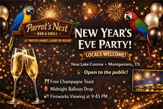 Ring in the New Year at Parrot’s Nest Bar & Grill, located inside Twisted Parrot Luxury RV Resort near Lake Conroe. Join us for a fun, festive New Year’s Eve celebration open to resort guests and the public.